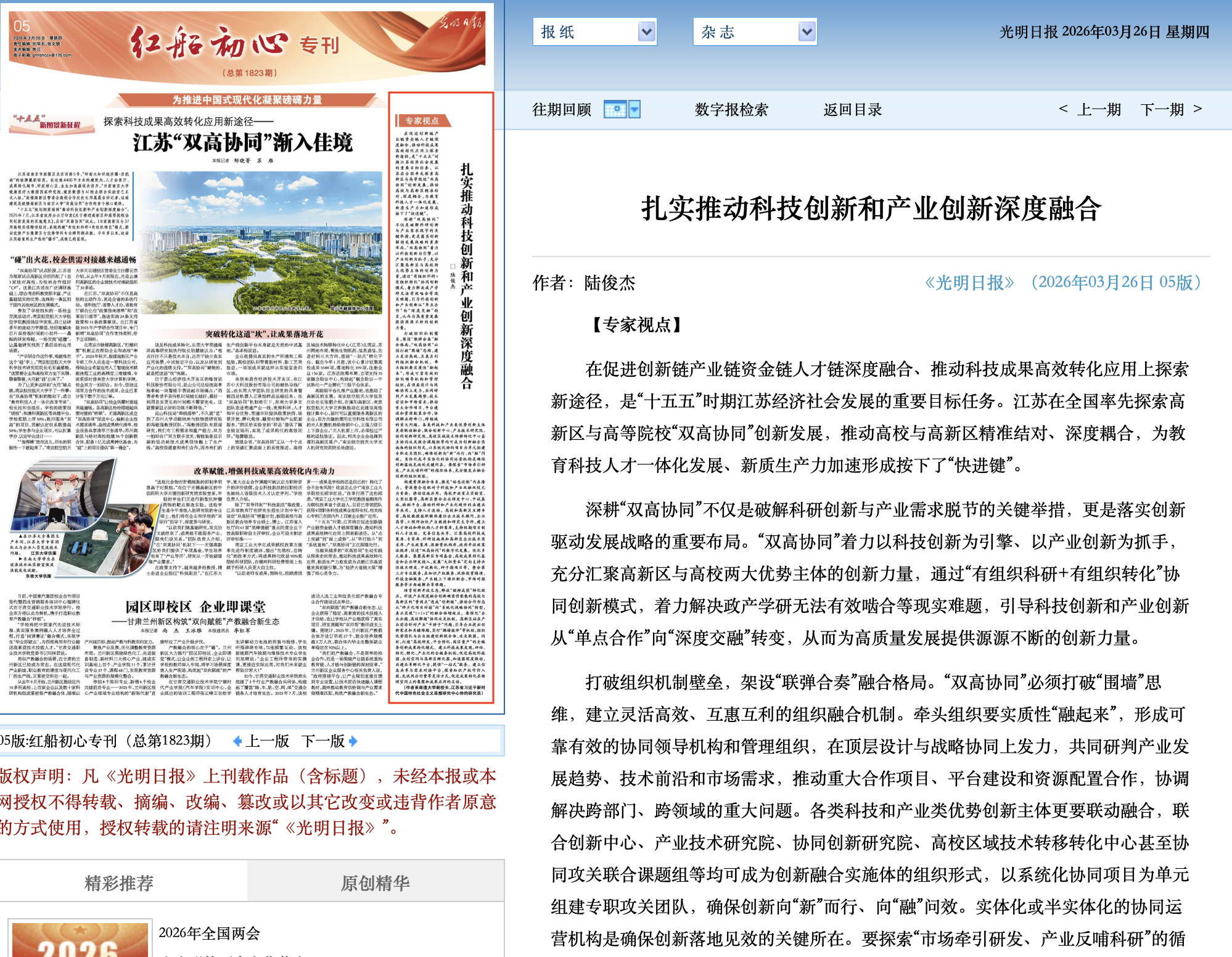 3月26日,《光明日报》刊发我校党委常委、副校长、江苏省习近平新时代中国特色社会主义思想研究中心特约研究员陆俊杰的理论文章《扎实推动科技创新和产业创新深度融合》。